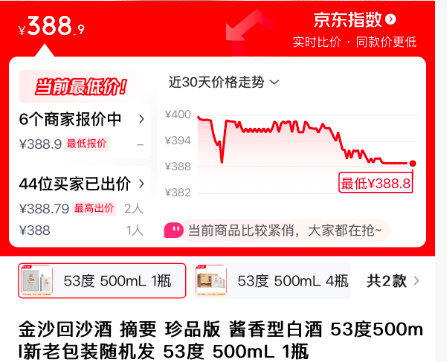 华润啤酒旗下的“摘要”酒,定位次高端到高端,价格带原本锁定在500-600元。但在当前市场环境下,“摘要”酒价格出现明显下跌,部分终端售价已跌破500元,相比高峰期下跌超百元。8月20日,京东指数显示,“摘要”53度500ml单瓶价格跌至388.9元,为近30天内最低价。