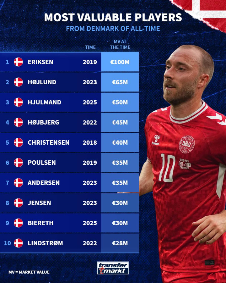 丹麦历史身价榜(均为欧元):